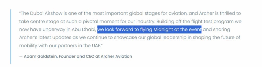 As early as August, the Airshow quoted CEO Adam Goldstein in promotional materials saying “Archer is thrilled to take centre stage at such a pivotal moment for our industry … we look forward to flying Midnight at the event.”