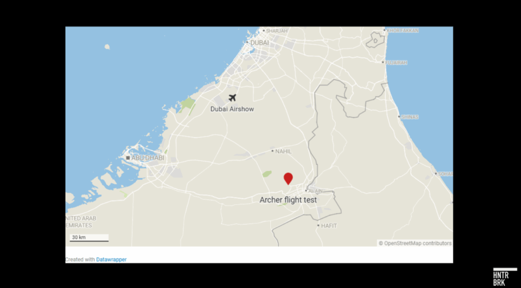 Hunterbrook Media geolocated the footage, placing the Archer flight test at Al Ain International Airport, over 50 miles from the Dubai Airshow that took place a week later.