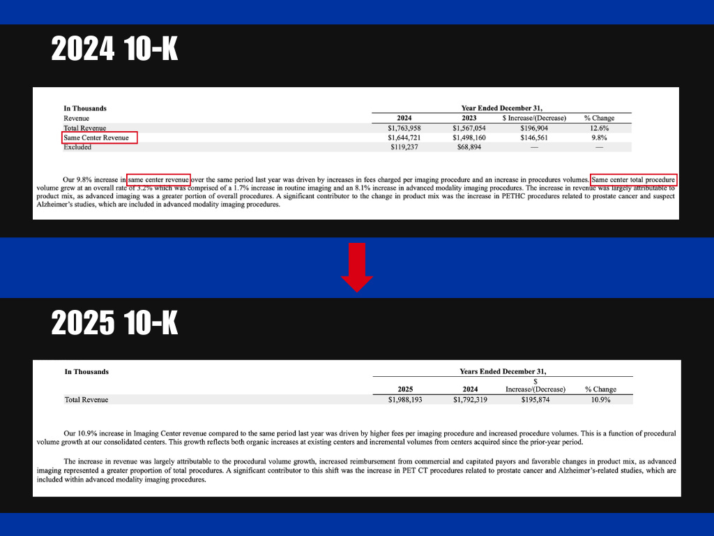 The contrast is stark. In RadNet’s 2024 10-K, “same-center” or “same center” showed up 18 times. This phrase appears a grand total of zero times in RadNet’s 2025 10-K filing.