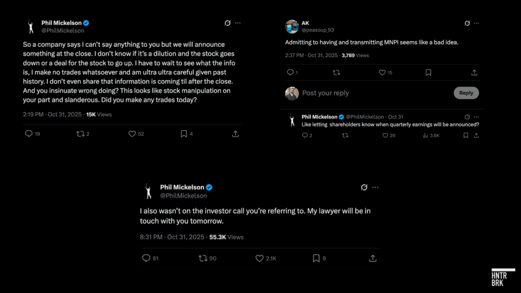 “I don’t know if it’s a dilution and the stock goes down or a deal for the stock to go up,” Mickelson wrote in response to Hunterbrook’s reporting in a comment on X Friday. “I have to wait to see what the info is.”