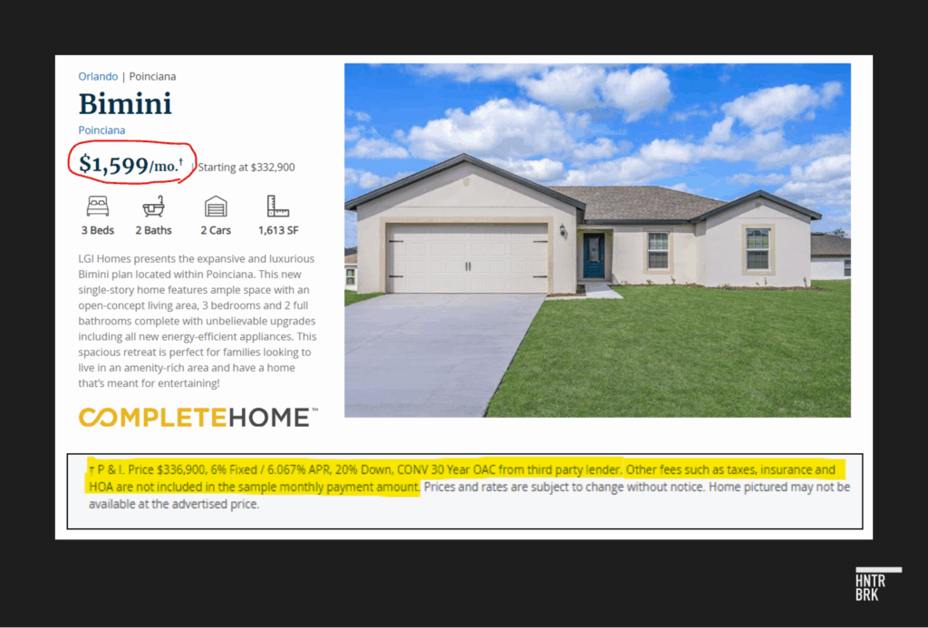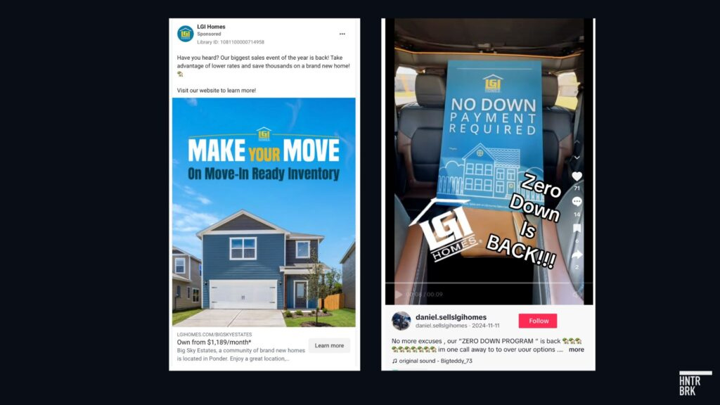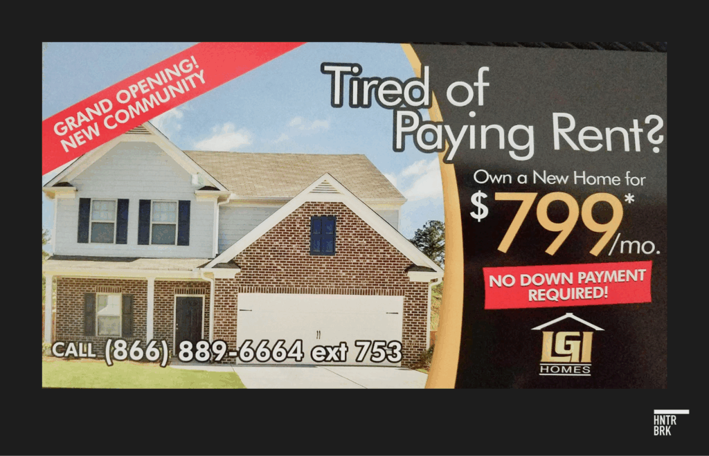 LGI sends out direct mail to nearby apartments and floods social media like Facebook, Craigslist, and TikTok with ads that display deceptively low monthly payments, omitting taxes, insurance, HOA dues, and other fees that could add at least 30% and as much as 70% to the headline price depending on the down payment and type of loan, according to Hunterbrook’s analysis.