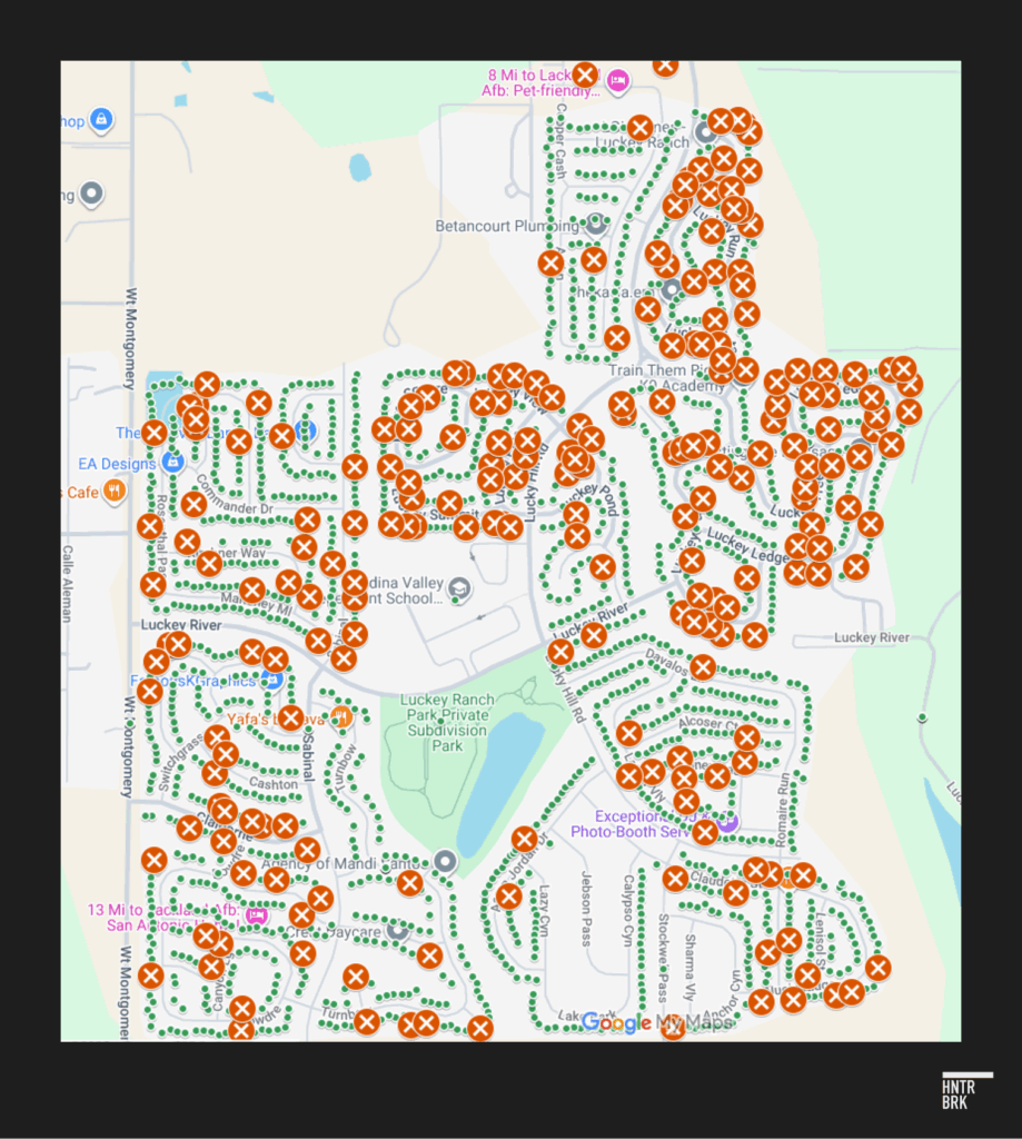 Hunterbrook found 235 unique addresses in Luckey Ranch, a master community built by LGI, that were associated with at least one foreclosure notice since 2011, according to Bexar County land records. According to the Bexar County Appraisal District, there are currently 2,457 parcels in Luckey Ranch.