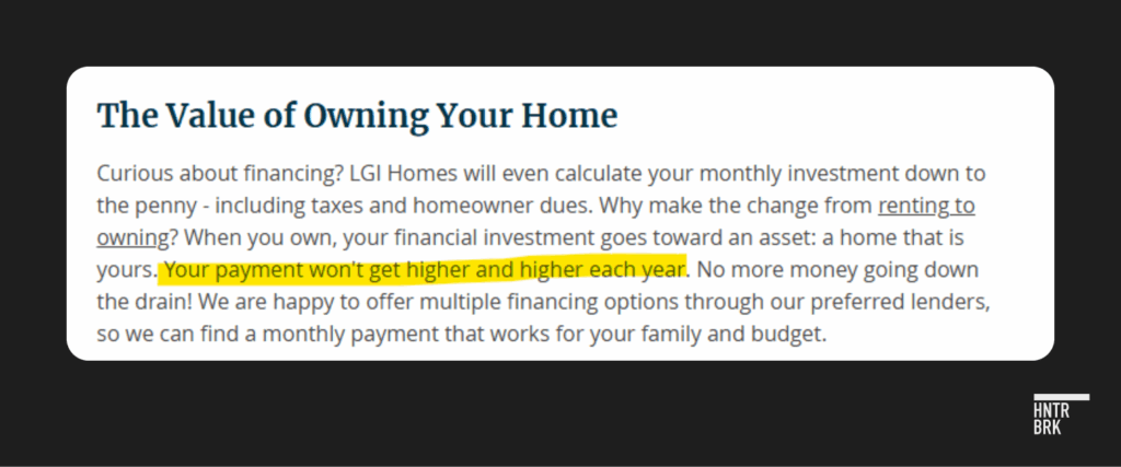 LGI’s marketing may also include another misleading claim to entice renters: Compared to rent, they say, which can go up every year, if you buy a home, “Your payment won’t get higher and higher each year.” But as any homeowner knows, taxes, insurance, and HOA fees tend to rise over the years, increasing the total monthly payment.