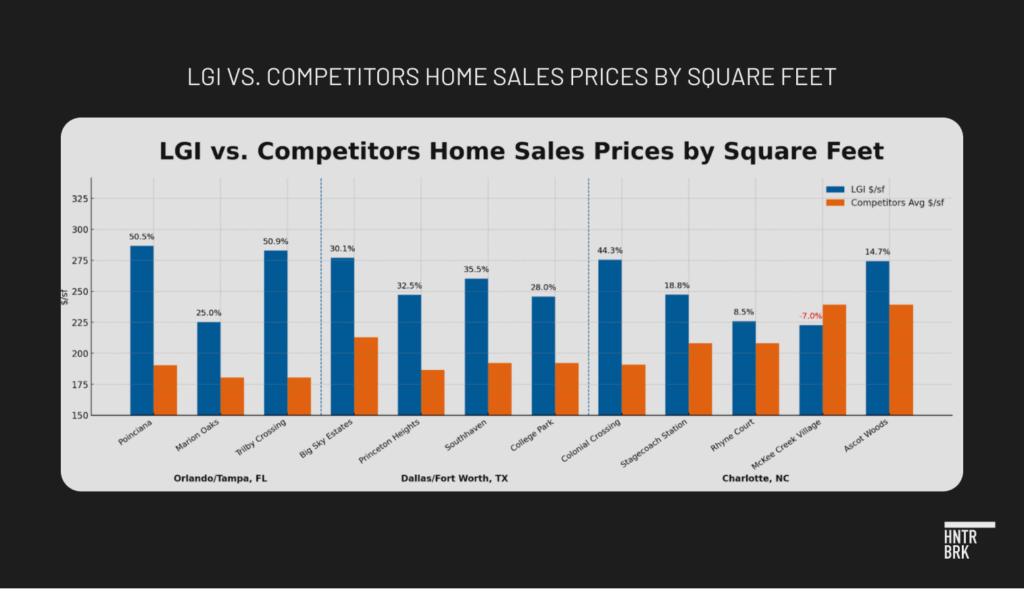 In Hunterbrook’s analysis of randomly selected neighborhoods in three of LGI’s top markets — Orlando-Tampa, Florida; Dallas-Fort Worth, Texas; and Charlotte, North Carolina — LGI homes as of early September were priced anywhere from about 9% to 51% more per square foot than those advertised by the top 10 national builders within a 12-mile radius, with the exception of one LGI community in Charlotte.