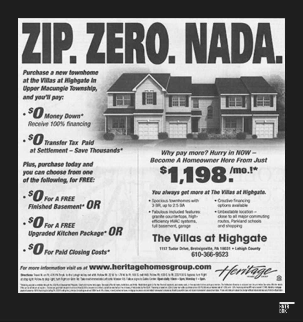 But such marketing tactics designed to draw shoppers have not gone unnoticed by federal regulators. The Federal Trade Commission in 2014 charged Pennsylvania homebuilder Heritage Homes with deceptive marketing for advertising low monthly payments with no down payment, without adequately disclosing terms such as “credit and income restrictions” and annual fees. Heritage Homes “tricked consumers into believing they’d found an affordable mortgage with very favorable terms,” the FTC said.