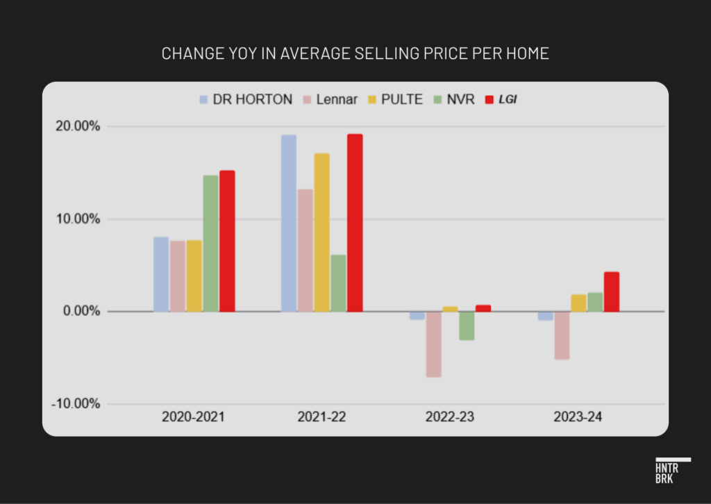 At the same time, LGI continued to raise home prices through the end of 2024, though not as aggressively as before, while D.R. Horton, Lennar, and NVR — three of the nation’s top four homebuilders — have lowered their prices at least once since 2022. Pulte Homes, the third-largest homebuilder in the country, which also did not lower their home prices, operates in a higher end of the market than LGI and the other top builders.