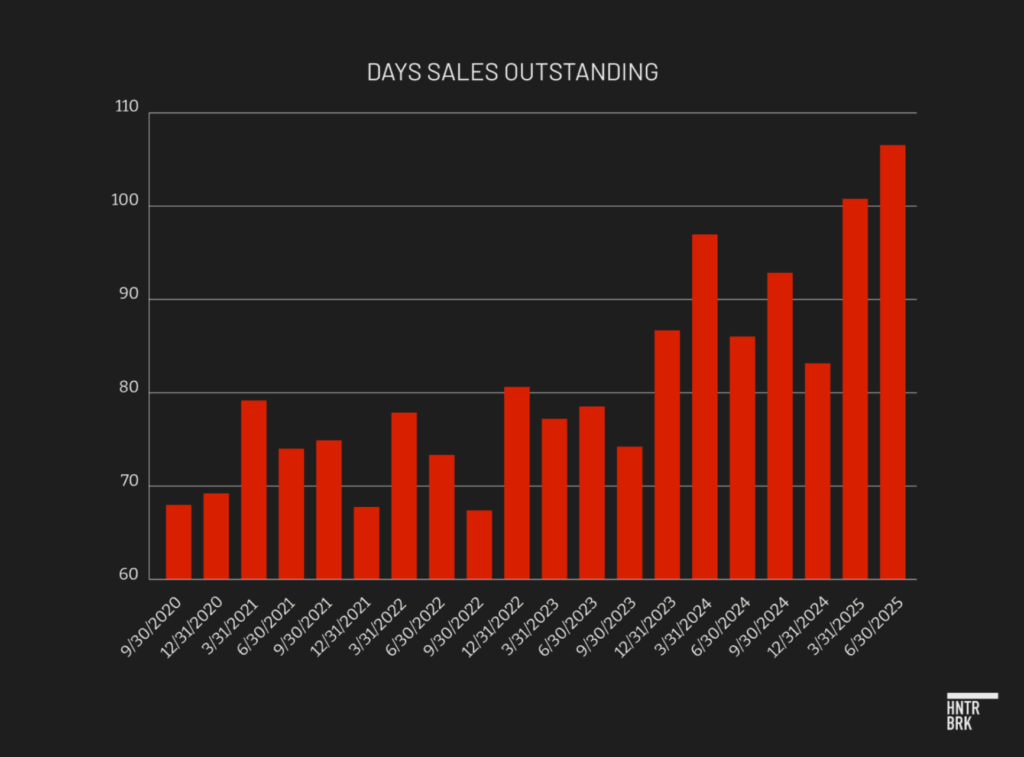 Days sales outstanding — the average time it takes sales to convert into cash — surged to a record 106 days in the quarter, up six days from Q1 and 20 days from a year earlier. This sharp rise in receivables suggests revenue is outpacing cash collection or that excess product is being pushed into distribution channels beyond actual end-customer demand, raising concerns about the quality of reported revenue.