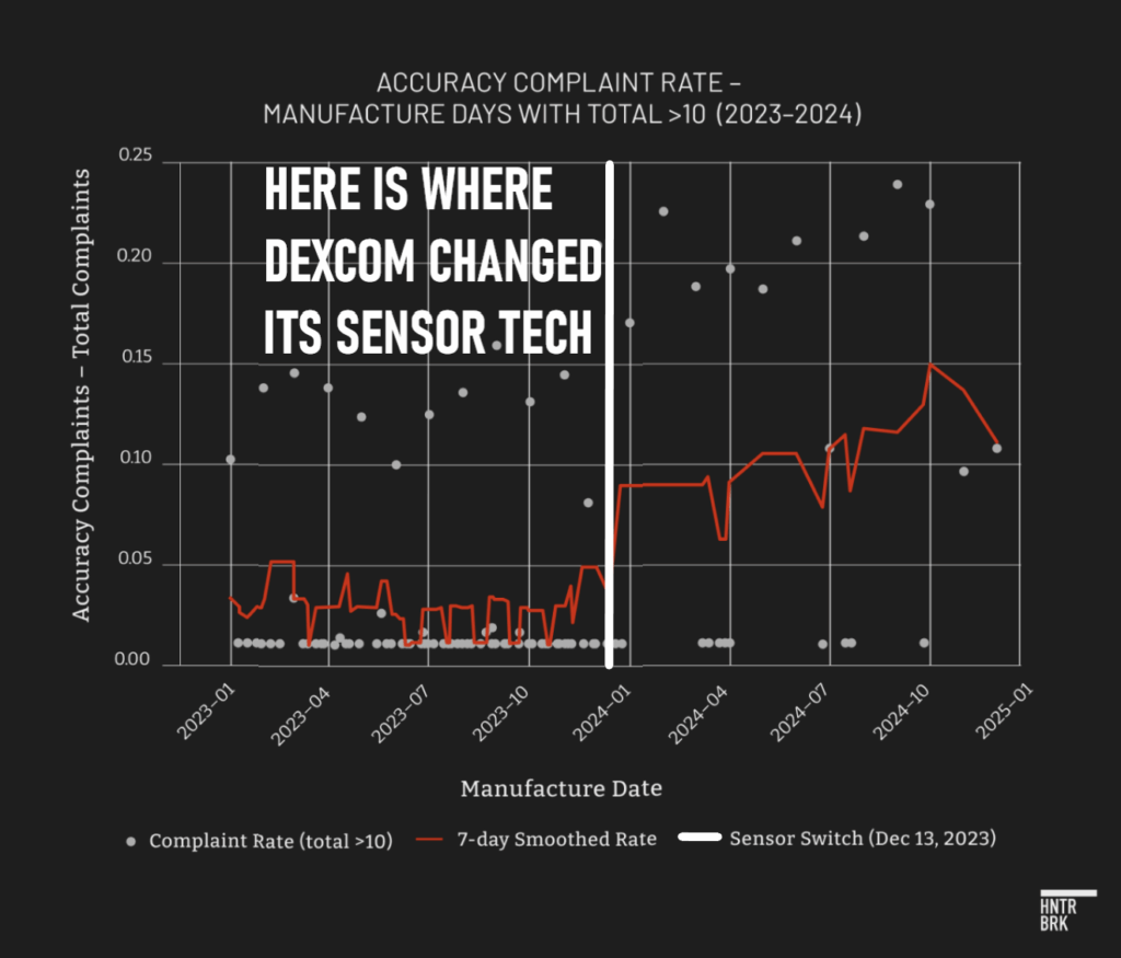 G7 accuracy reports spiked dramatically for devices manufactured after December 2023, just when, as the FDA revealed, Dexcom implemented its unauthorized material change.