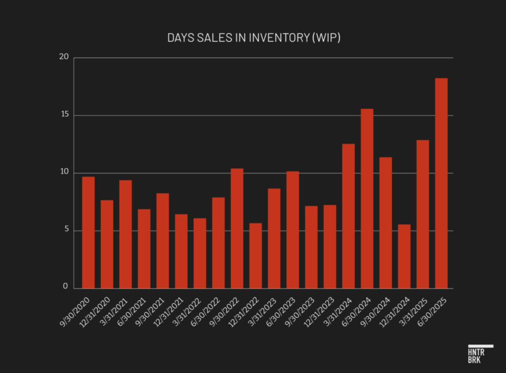Work-in-process (WIP) days of inventory spiked to 18 days — more than double the 2023 quarterly average of 8 and well above the average of 11 in 2024.