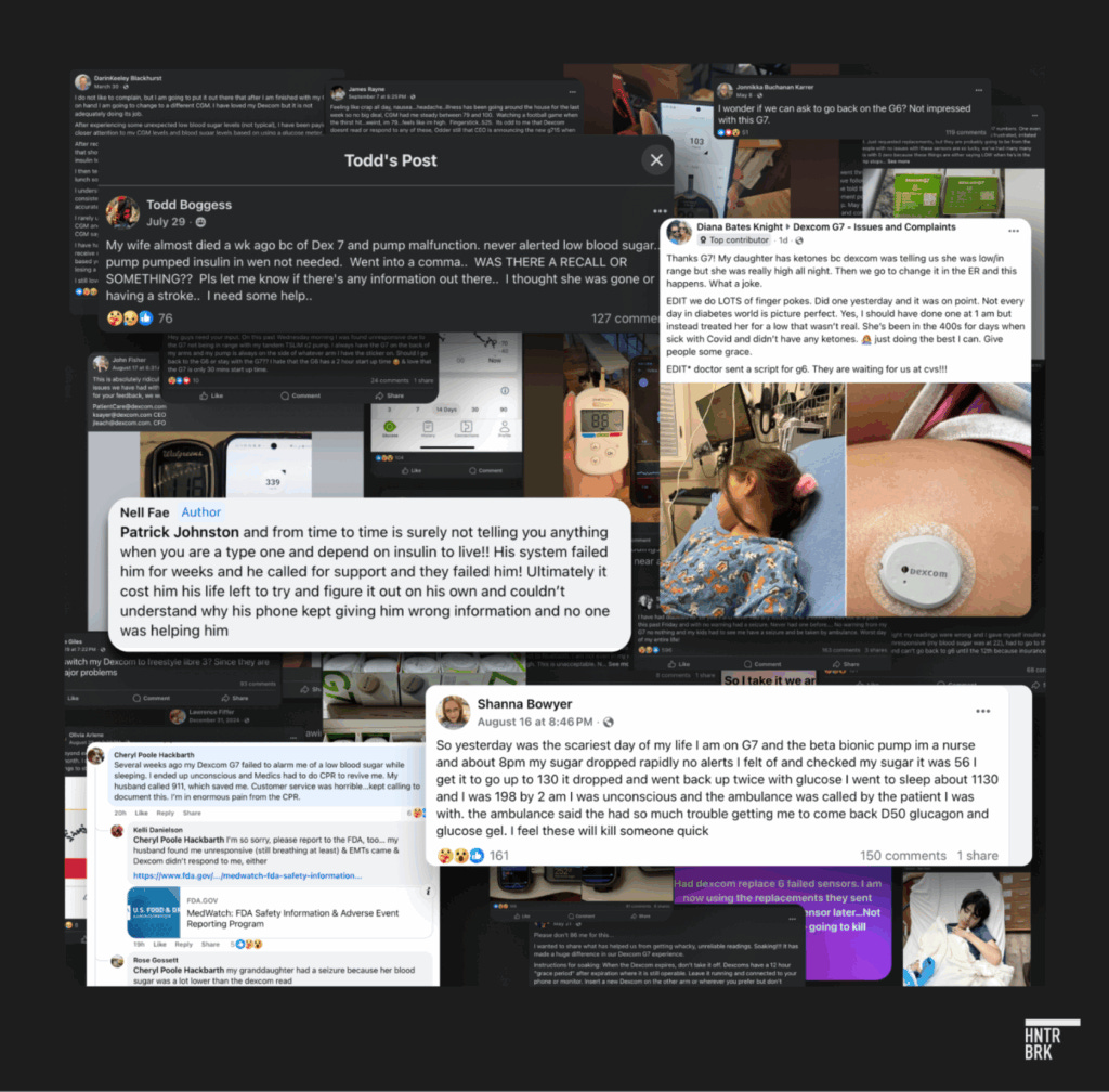 G7 users have been hospitalized and died: Billy Sosbe lost his life in June after his G7 gave him incorrect glucose readings. Diana Bates Knight’s six-year-old daughter was rushed to the ER when her G7 misread her blood sugar by hundreds of points. Bob Hawkinson passed out behind the wheel when his G7 failed to alert him to dangerously low blood sugar. These aren’t isolated incidents. More than a dozen other G7 users interviewed by Hunterbrook said they felt betrayed by a technology that had once been life-changing. According to a law firm investigating the G7 following a recall and FDA warning letter, at least 60 people claim to have been hospitalized and multiple others allege death connected to G7 issues. A Facebook group for G7 problems exploded to more than 58,000 members in just over one year.