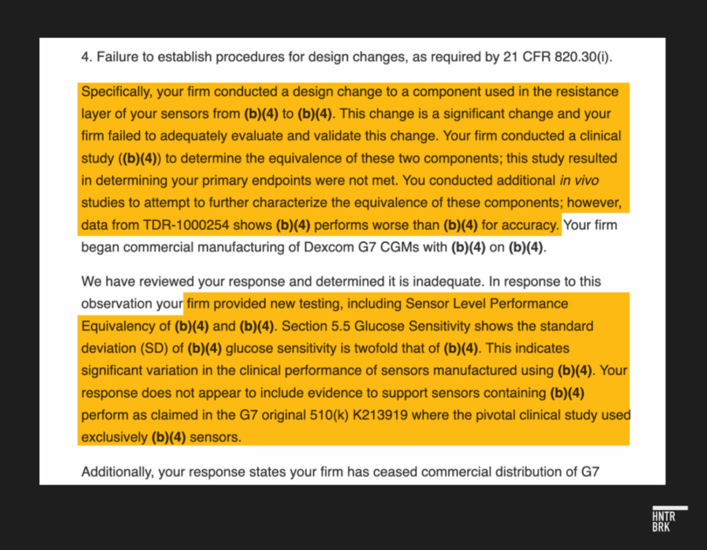 This change to a “critical raw ingredient” required regulatory clearance before implementation, according to the FDA.6 Dexcom never sought that FDA sign-off, apparently because they believed the change was “non-significant.”
