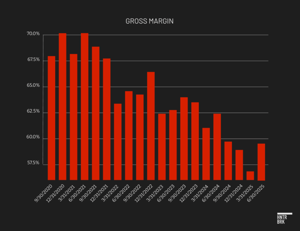 Gross margin has now fallen year over year for 15 consecutive quarters, slipping to 59.5% in the second quarter. While the company has offered a range of explanations, the problems appear structural rather than temporary. Analyst notes at banks ranging from Goldman Sachs to JPMorgan have recently targeted gross margins well above 60% as consensus benchmark, alongside >15% annual growth.