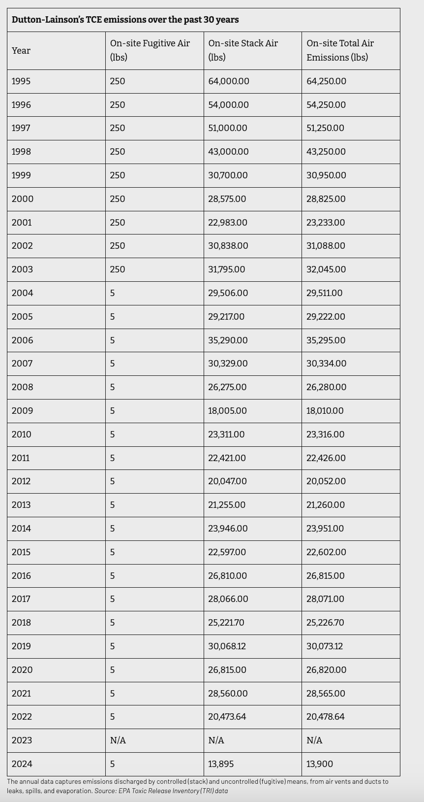 Over the past 30 years, Dutton-Lainson has emitted an average of about 30,000 pounds of TCE annually, according to emissions numbers the company submitted to the EPA Toxic Release Inventory (TRI).