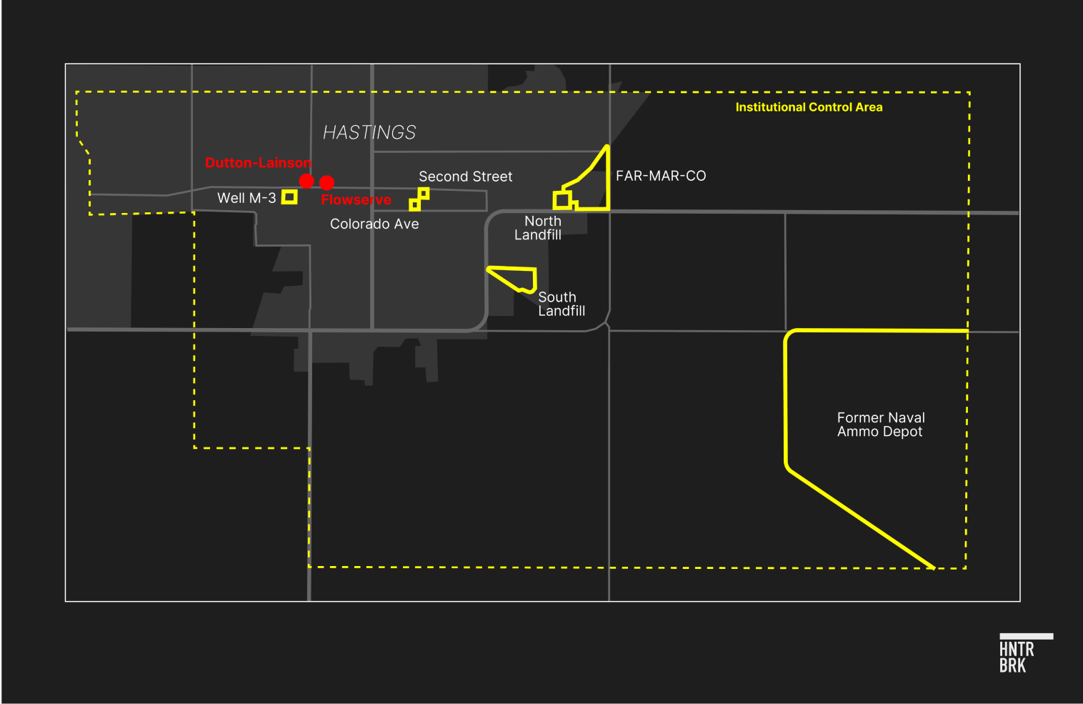The agency calls the Hastings Superfund site one of its “largest and most complex groundwater cleanup projects,” with seven subsites. The contamination stretches about five miles from the city center to the east and southeast.