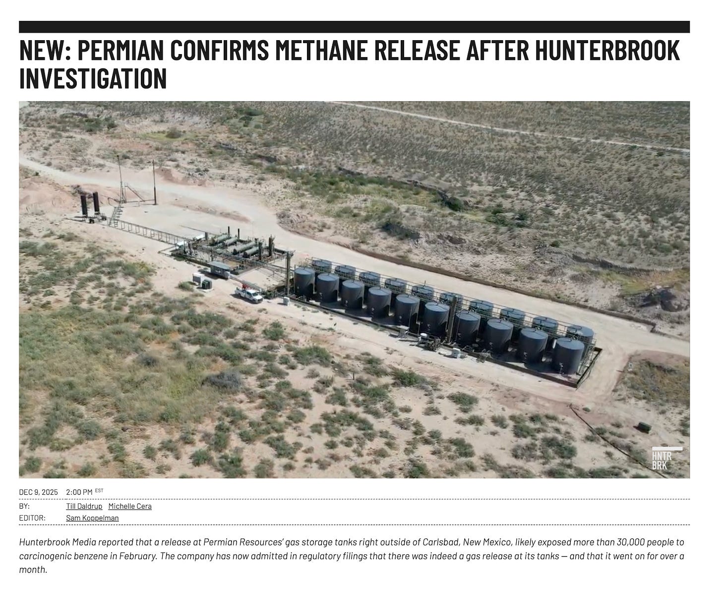 We also posted a breaking news update to our Permian Resources story last week, which is worth your time. After initially ghosting Hunterbrook, Permian admitted to regulators there had indeed been a gas release at its tank battery earlier this year.